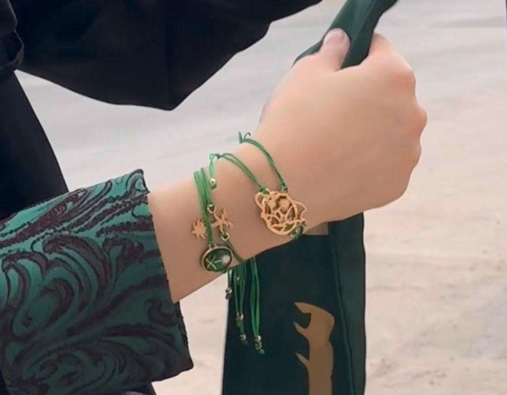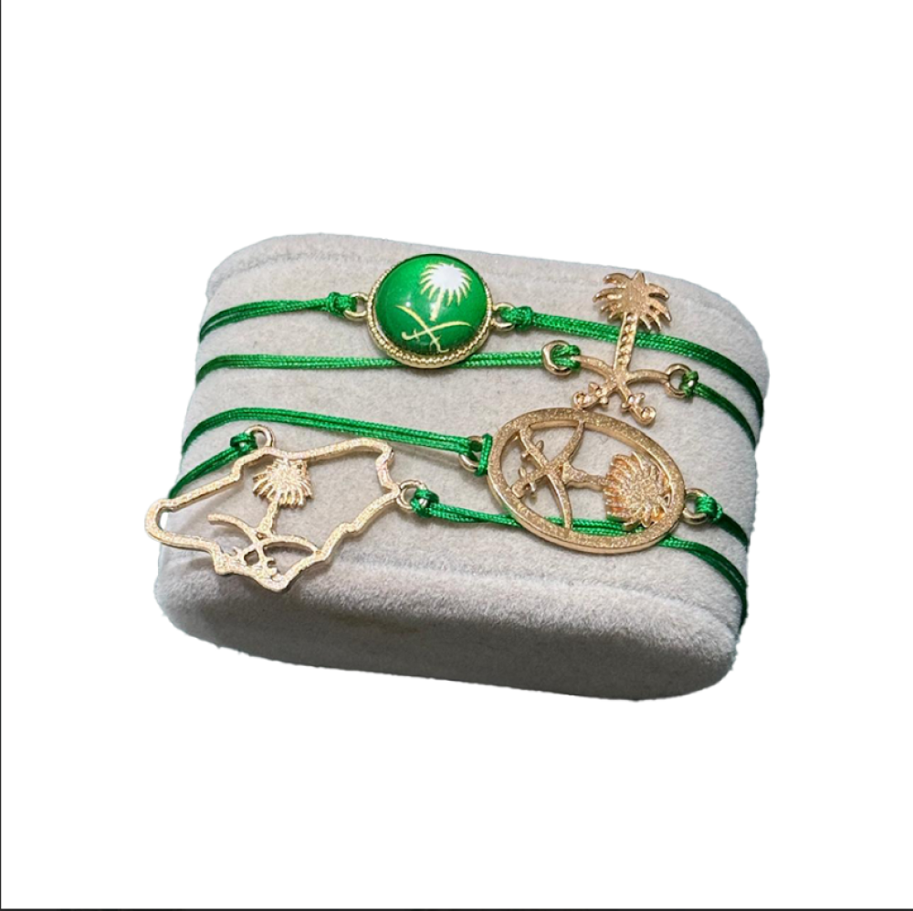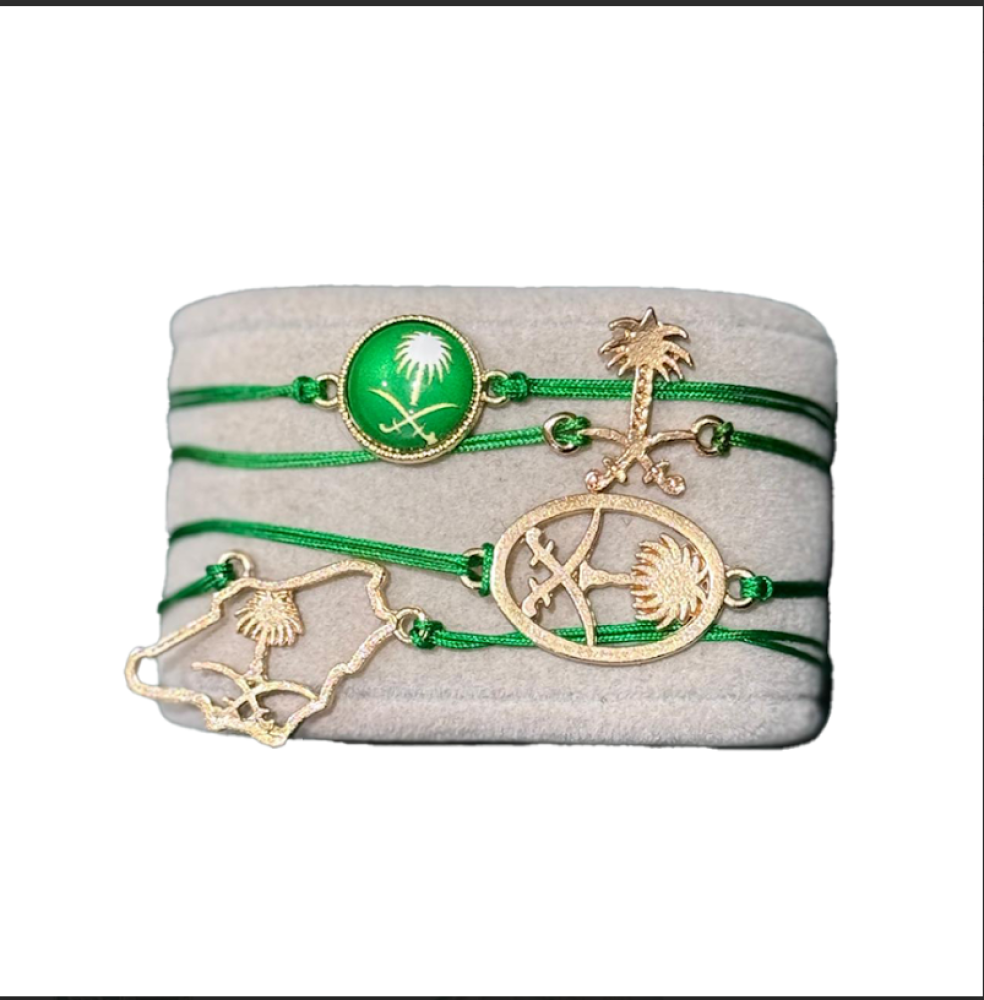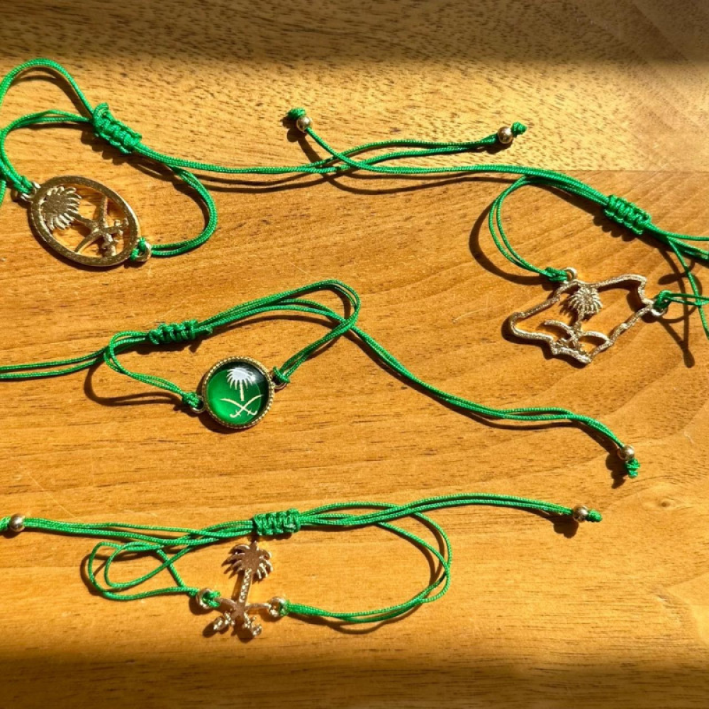 اساور يد بخيوط بلون الاخضر وبشعار السعودى ملونه بذهبي وبتصاميم مختلفه لتعطى يدك اناقه لا مثيل لها في اليوم الوطني