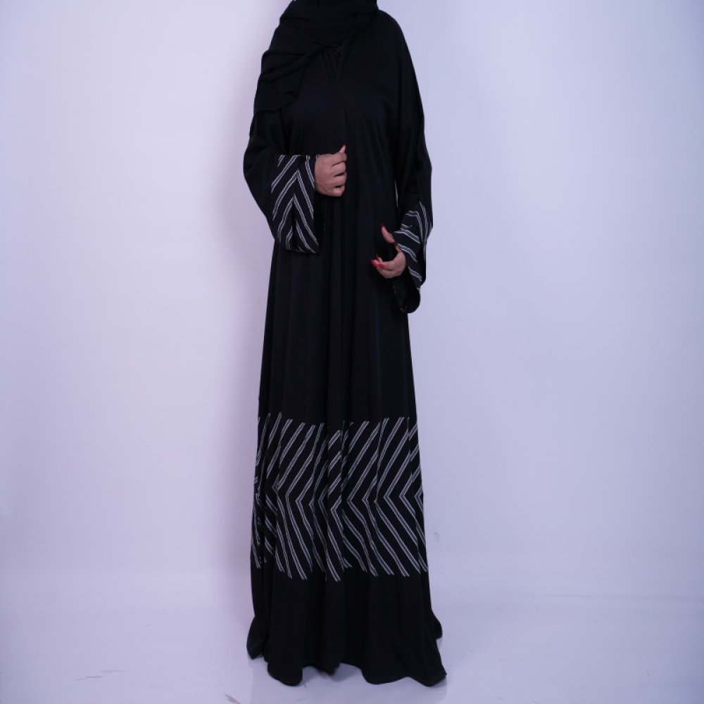 عباية سوداء بقماش كريب ياباني بقصه كلوش كامل مع تكحيلة بقماش مخطط اسود وابيض